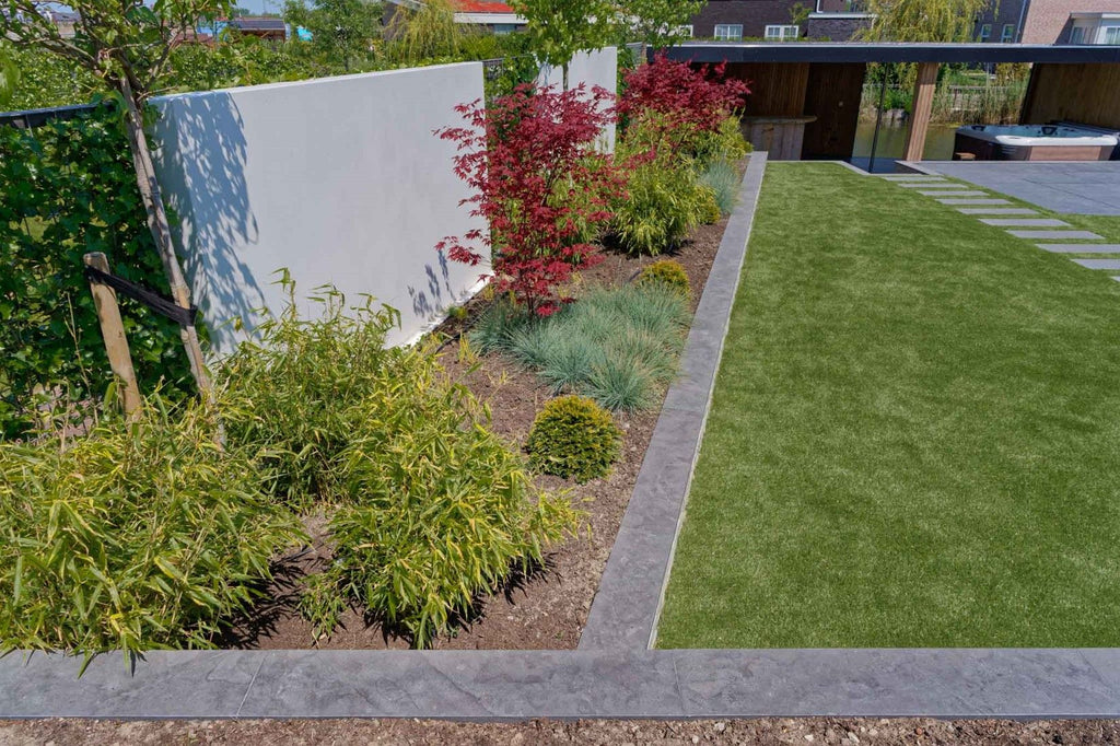 Als u verhogingen of trappen, maar ook uw vijver met dezelfde materialen afwerkt als de bestrating, maakt dat uw geometrisch of strak vormgegeven tuin helemaal af. Daarom zijn er in de serie Asian Bluestone naast het al zeer complete programma tegels ook opsluitbanden, traptreden en vijverafdekranden in diverse afmetingen beschikbaar. Alle producten uit deze lijn zijn voorzien van een facet geslepen randafwerking. Informeer bij uw leverancier naar de vele verschillende afmetingen.
